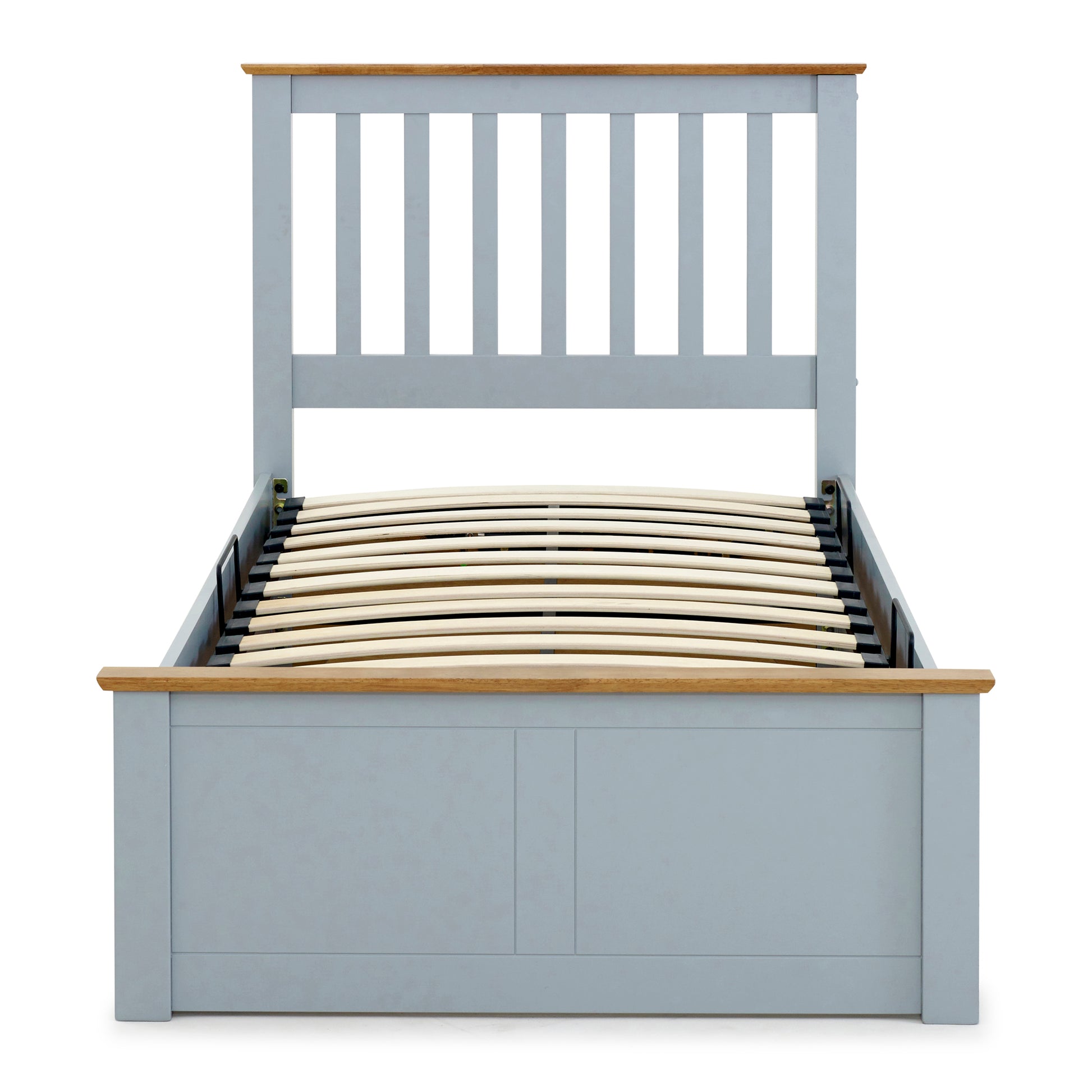 Single bed with innovative ottoman storage.Gas-piston assist for ease of lifting.Supportive sprung slatted base for comfort.