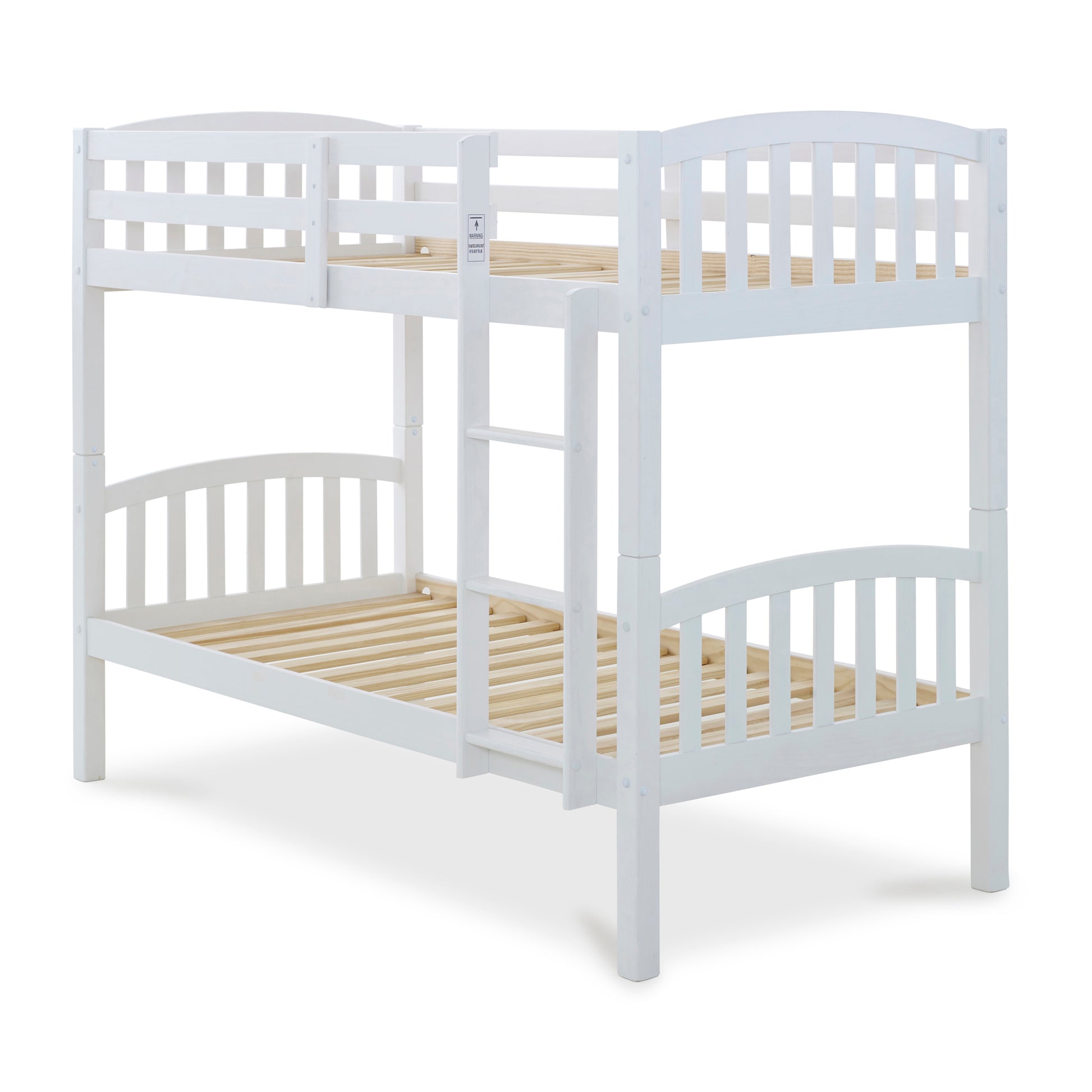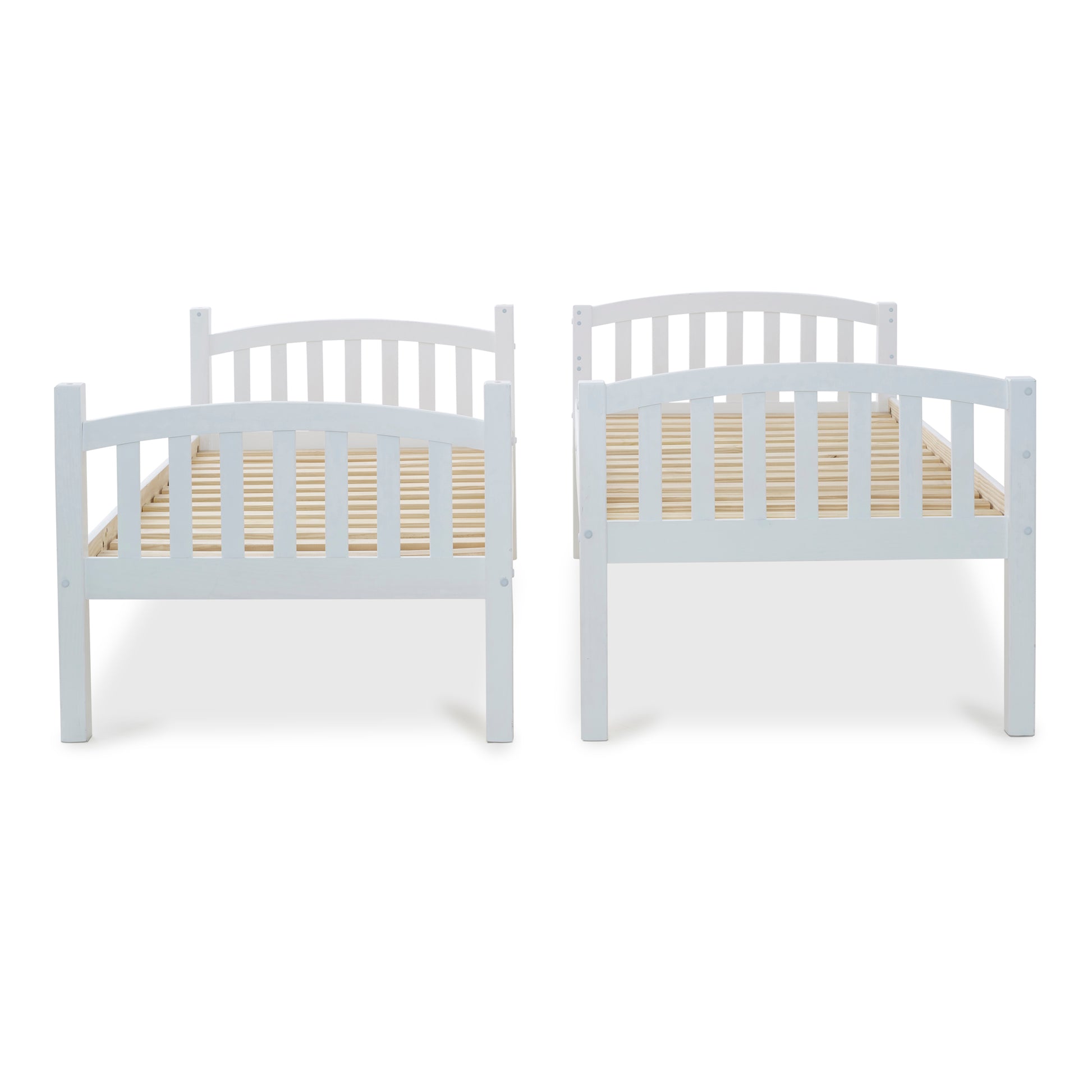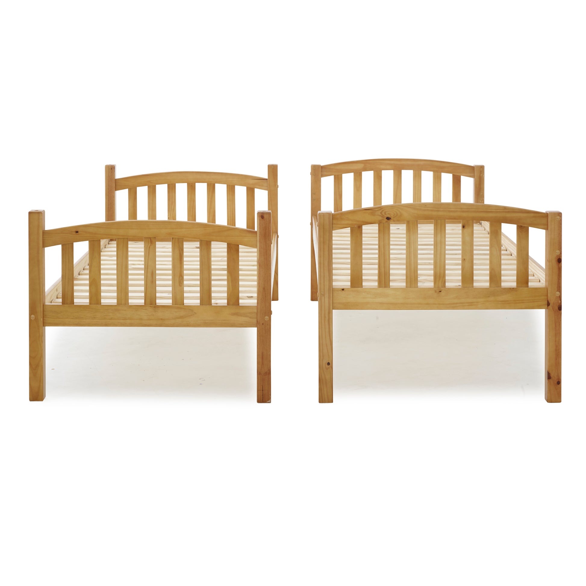 The Mya Single Bunk Bed Frame offers a contemporary and modern look for your bedroom. The bunk bed is made using high-quality pine wood, making it very strong and sturdy and is finished in a lacquer. There are 4 guard rails to the top bunk, 2 to either side which ensures safety for the top bunk sleeper. The ladder is fixed to the right side. The bunk bed can be easily separated into two Single beds and both feature solid slatted bases which provide extra support to the mattresses (sold separately). The headboard and footend of both top and bottom bunks are styled in a matching vertical slatted design.