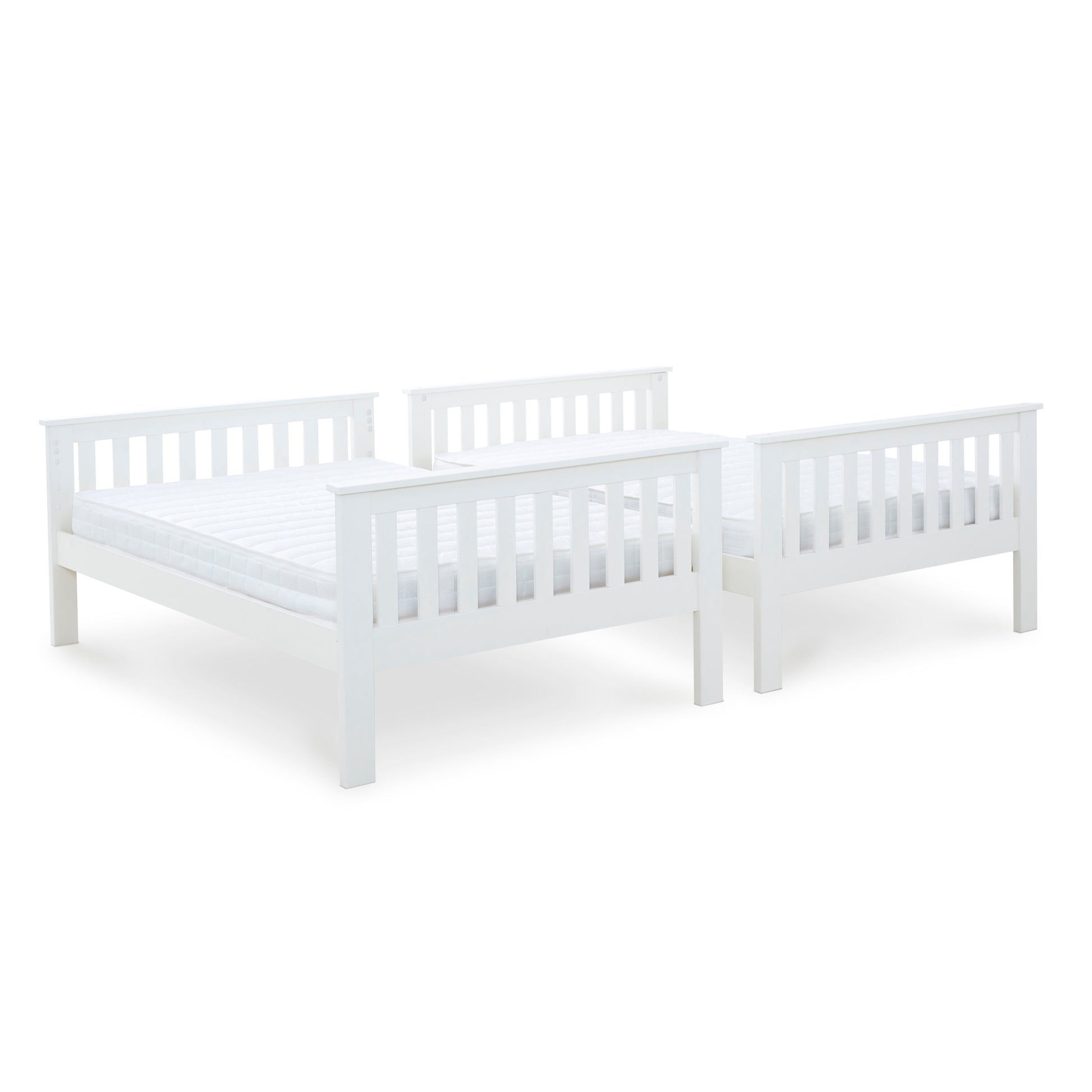 The Oslo Quadruple Bunk Bed brings forward a new concept of a double bunk bed. With a Small Double top and bottom, this bed can easily accommodate 4 people. The bunk bed frame can easily be split and used as two separate Small Double beds. Mattresses (sold seperately) are supported by the strong wooden slatted base for extra comfort. The bed comes with an adjustable (left and right) ladder which makes it easier to climb into the top bunk. This bed is constructed using high quality Pine wood and has a very sturdy build. The contemporary finish and gapped design make it suitable for any bedroom. It is a perfect option for saving space and is ideal for both adults and children. This bed comes flat packed for ease of delivery and assembly.