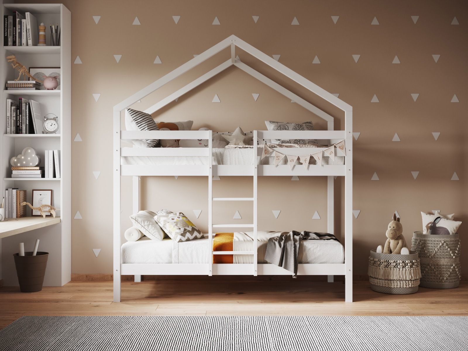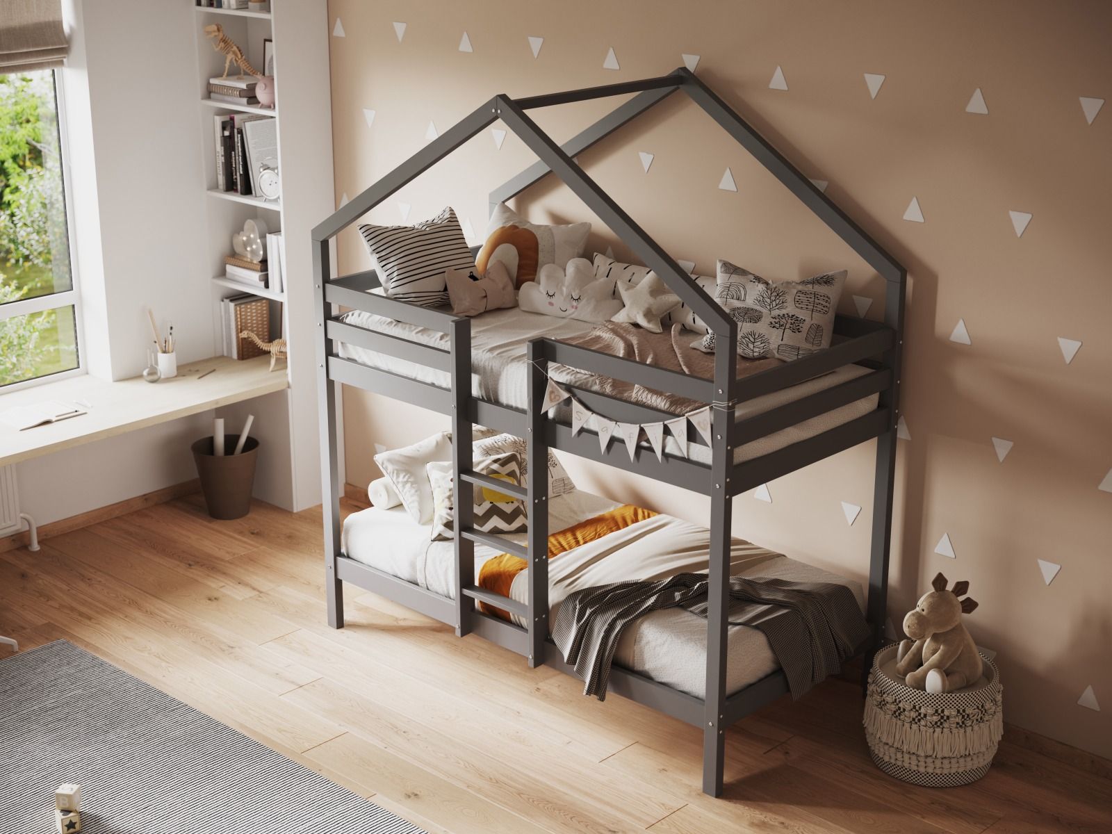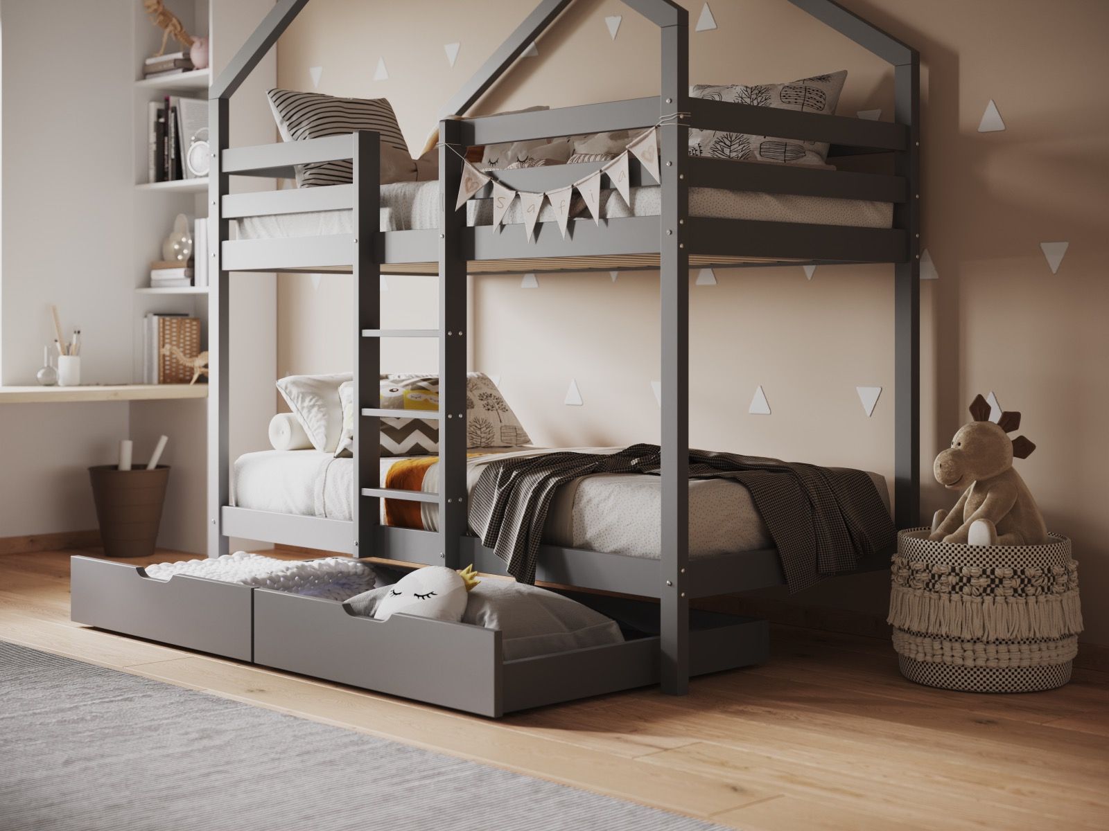 Looking for a stylish and practical bunk bed for your child's room? Look no further than our house bunk bed in white or grey. With its unique design that looks like a miniature house, complete with a peaked roof that adds a playful and imaginative touch to the design, this bunk bed is sure to be a hit with kids and parents alike.