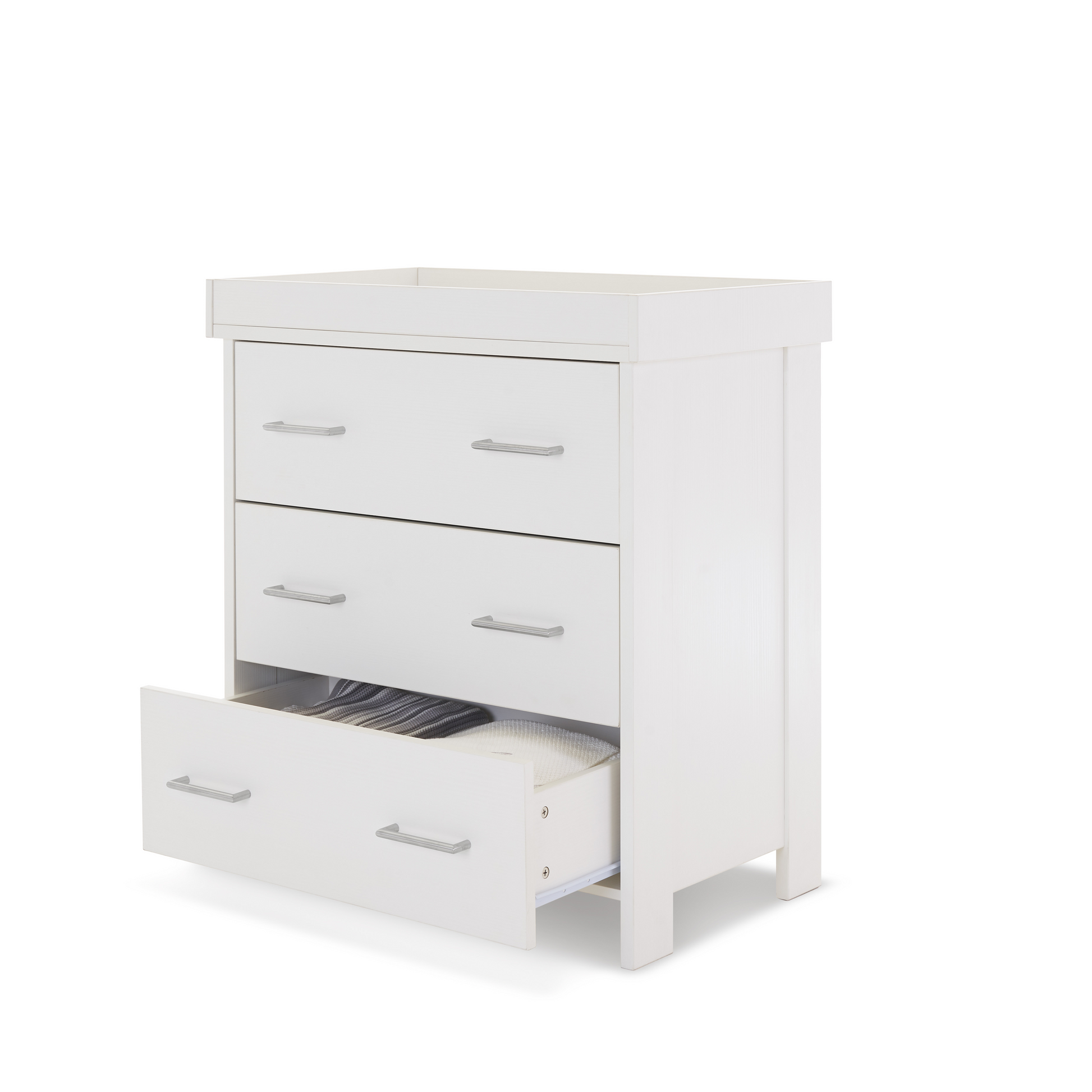 The Nika changing unit is a piece of furniture that can be used for years to come. Three large 32L capacity, full depth drawers offer plenty of space for changing essentials, toys and your little one’s precious possessions. All three drawers feature two brushed metal handles and glide on smooth runners allowing you to easily open them with either hand.