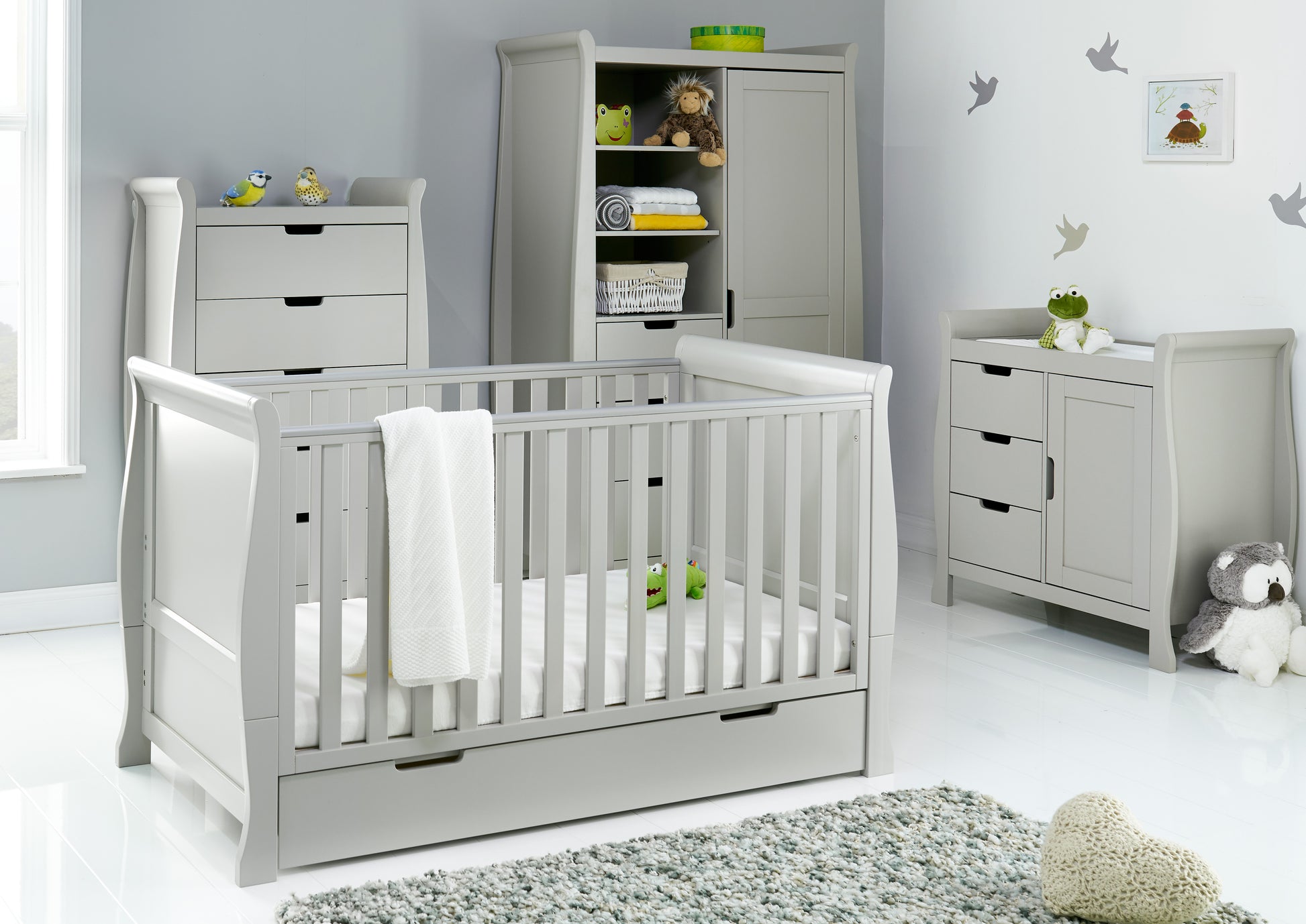 The Obaby Stamford furniture range offers families the perfect combination of style, quality and practicality. The Stamford Classic 4 piece room set consists of the beautiful Stamford Classic cot bed with under drawer, closed changing unit,tall chest of drawers and double wardrobe . All pieces feature the same elegant sleigh design that flows throughout the Stamford range.