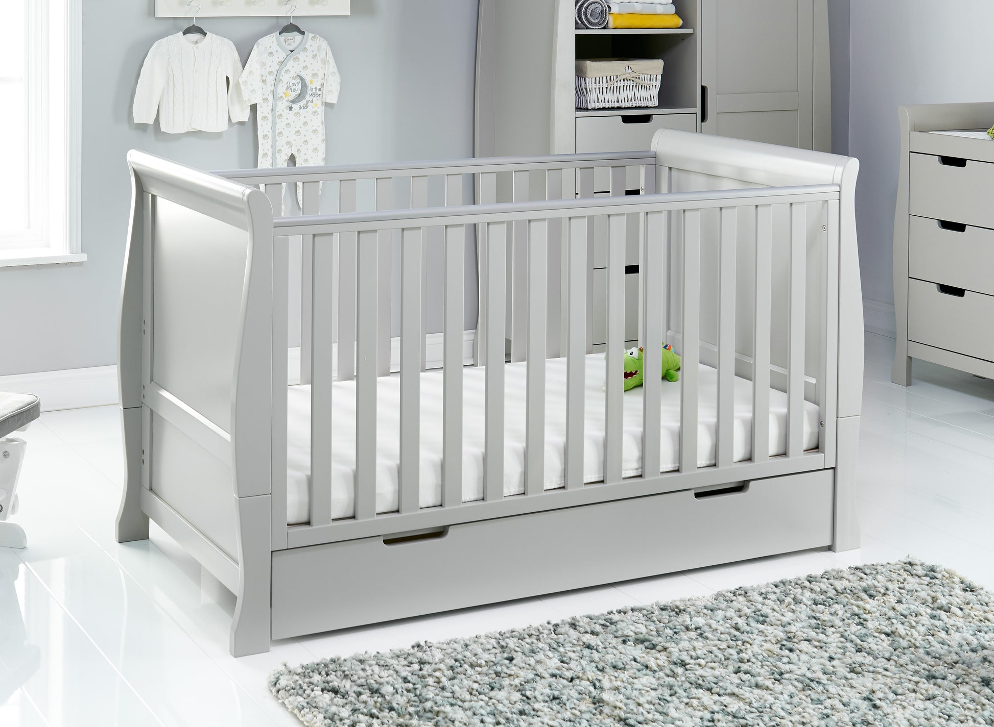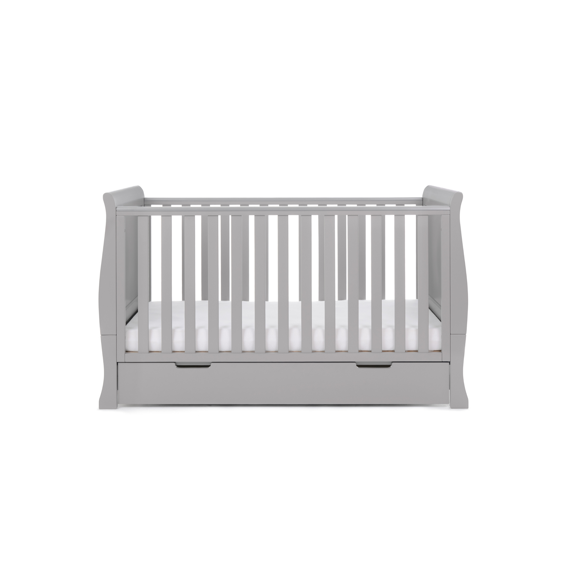 At the heart of the range is the beautiful Stamford Classic sleigh cot bed, with its elegant sleigh design offering traditional styling with a contemporary finish. Teething rails protect your child’s delicate teeth and the slatted sides ensure you can watch over your little one during their most peaceful times. The Stamford Classic offers an adjustable mattress base, the top position allowing you to put down your newborn without unnecessary bending and as your child grows, learning to sit and stand, the base can be lowered by two further positions to ensure your little one is safe and secure at all times. Once your child is old enough the Stamford Classic can be transformed into a stylish toddler bed to provide the perfect night’s sleep up until they are approximately four years old. Requires an Obaby 140 x 70cm mattress.